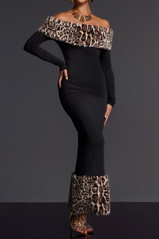 clara Off Shoulder Leopard furry Maxi Dress in black