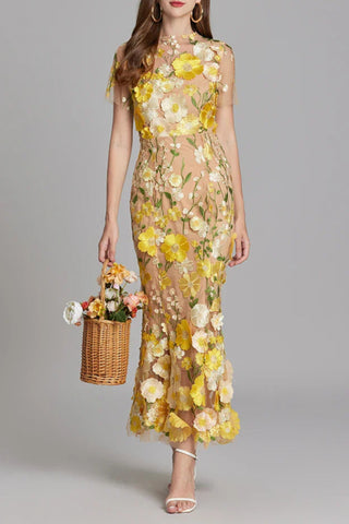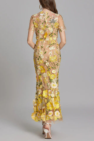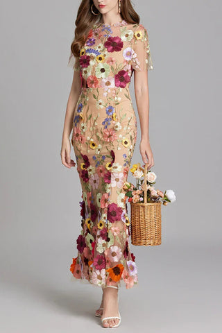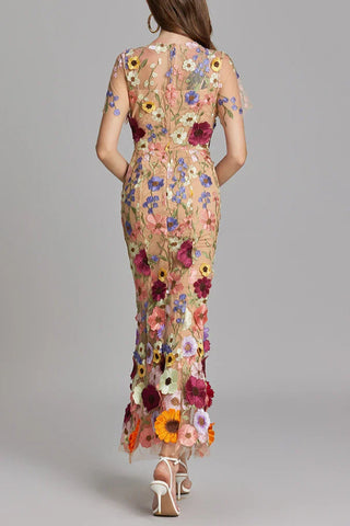 CAROL ROSE RED FLORAL EMBROIDERY MESH FISHTAIL MIDI DRESS