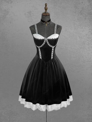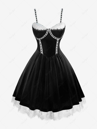 Gothic Plus Size Rose Flower Mesh Jacquard Lace Trim Contrast Piping Velvet A Line Dress