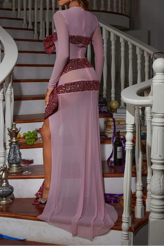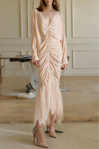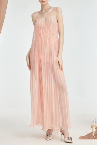 lantern sleeve pleated maxi dress in pale pink