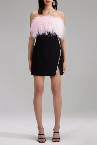 STRAPLESS FEATHER PEARL MINI DRESS IN BLACK