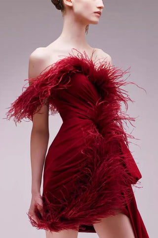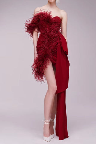 STRAPLESS SEQUIN FEATHER MINI DRESS